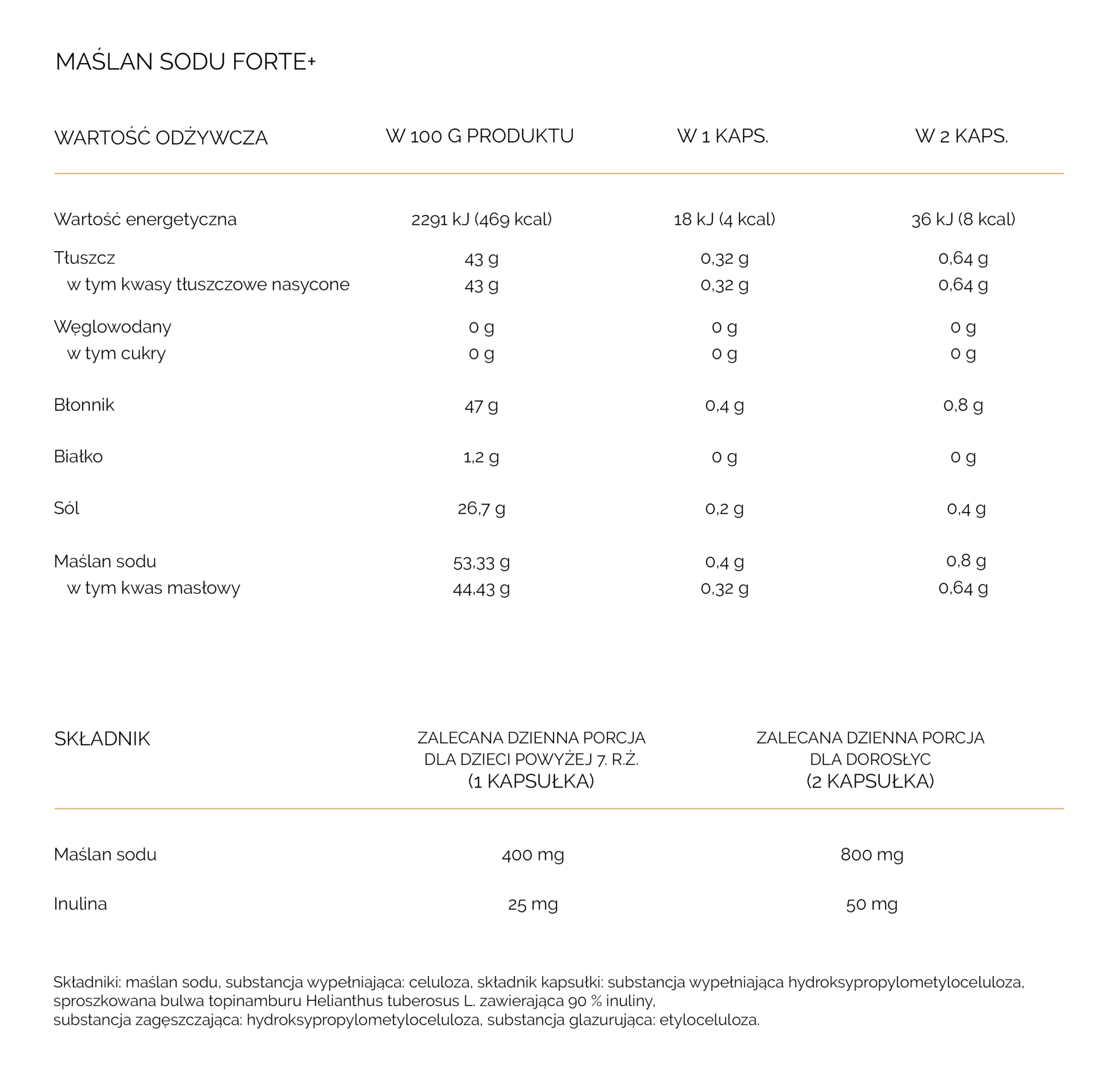 - Wysoka zawartość maślanu sodu w porcji dziennej