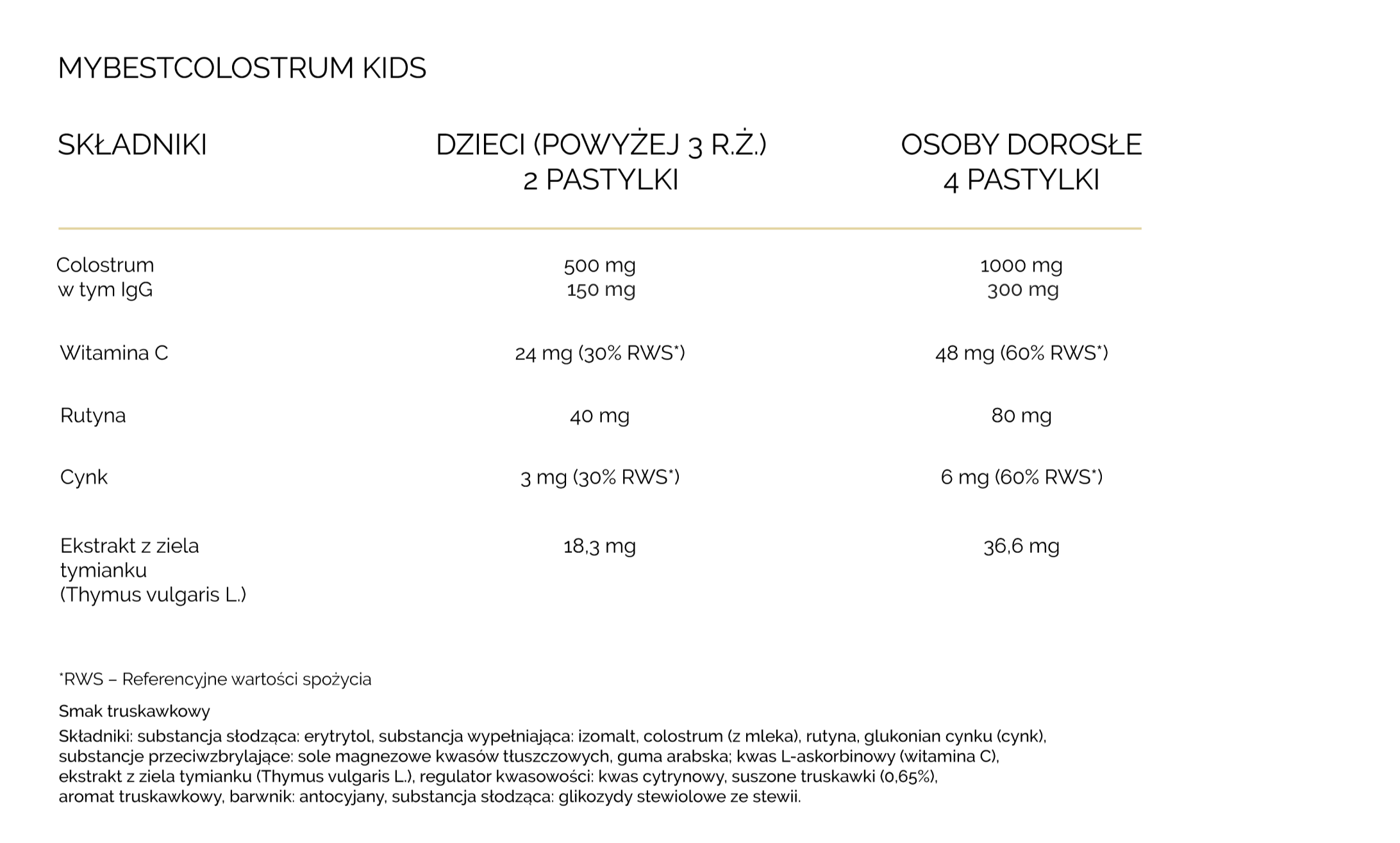- Colostrum bovinum pochodzące z wysokiej jakości mleka. Nie zawiera cukru, glutenu i konserwantów